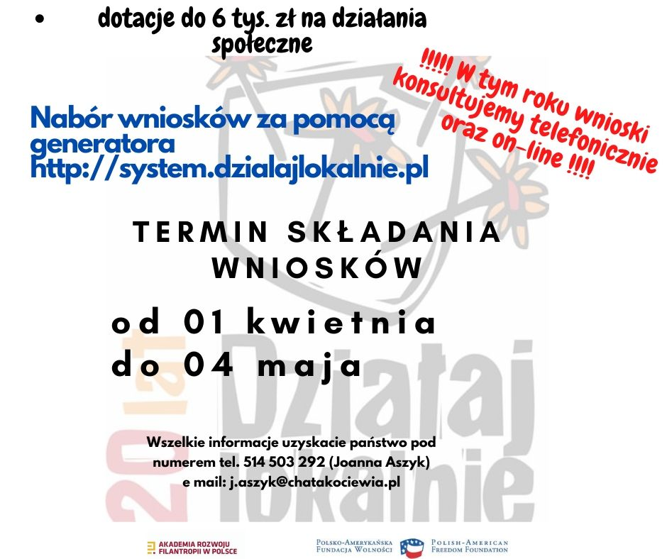 Ośrodek Działaj Lokalnie- Lokalna Grupa Działania „Chata Kociewia” ogłasza nabór wniosków w ramach Programu Działaj Lokalnie. Zachęcamy do złożenia wniosku a także do kontaktowania się z naszymi pracownikami. Wyzwólcie społeczną energię!