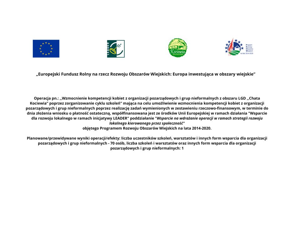 Serdecznie zapraszamy na szkolenie organizowane w ramach operacji własnej pn. ,,Wzmocnienie kompetencji kobiet z organizacji pozarządowych i grup nieformalnych z obszaru LGD „Chata Kociewia” poprzez zorganizowanie szkoleń”.
