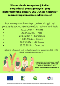 Serdecznie zapraszamy na bezpłatne szkolenie pt. „Kobiece kręgi, czyli połączenie poczucia świadomości z ruchem” organizowane w ramach operacji własnej ,,Wzmocnienie kompetencji kobiet z organizacji pozarządowych i grup nieformalnych z obszaru LGD „Chata Kociewia” poprzez zorganizowanie cyklu szkoleń”.